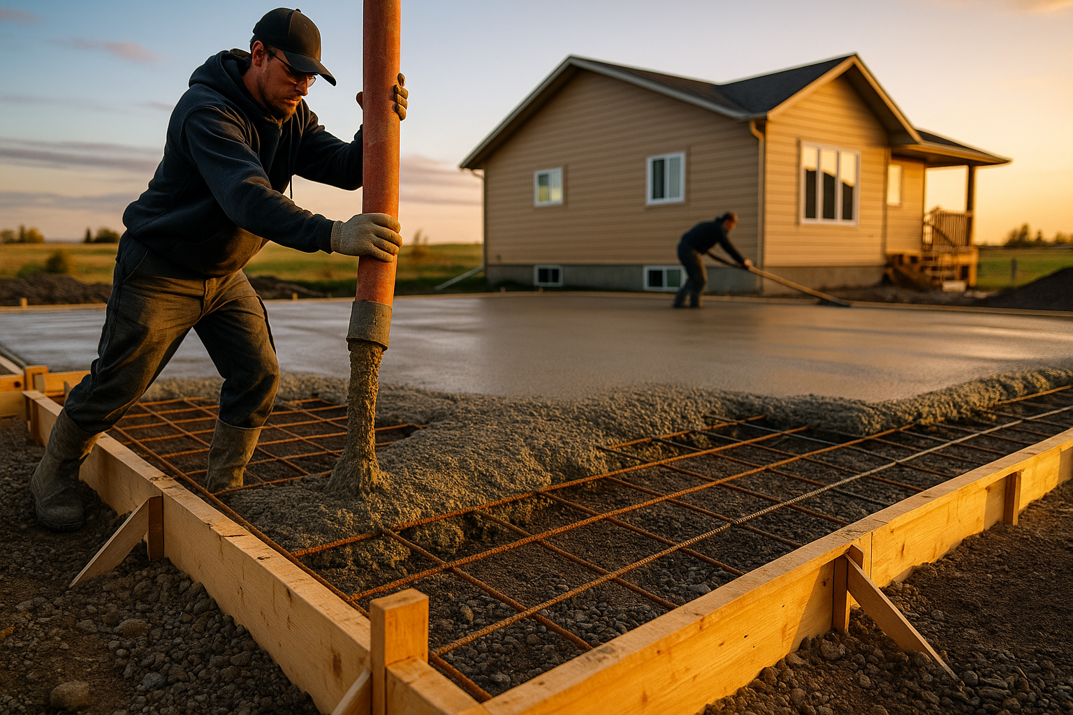 Poured concrete elements are reinforced with rebar and grade beams to resist soil movement and embed design loads—ideal for everything from garages and shop floors to driveways and patios.